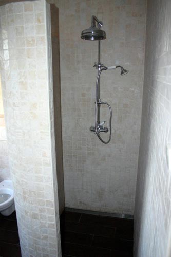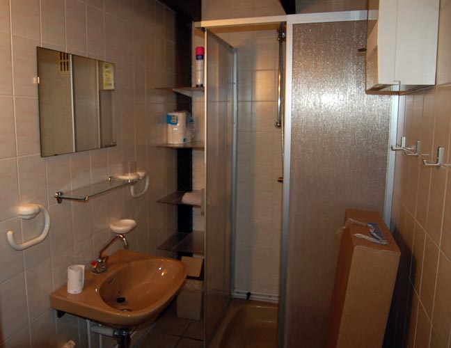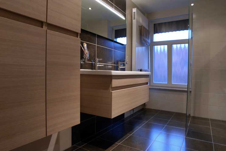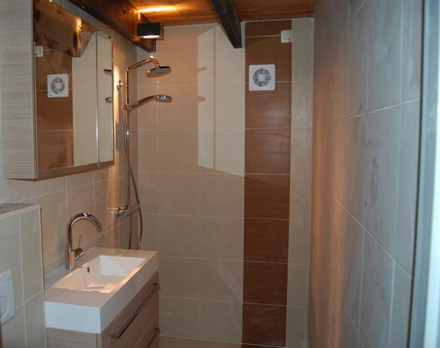 In een bestaande doucheruimte van beperkte afmetingen is een sfeervolle mini-badkamer gemaakt.