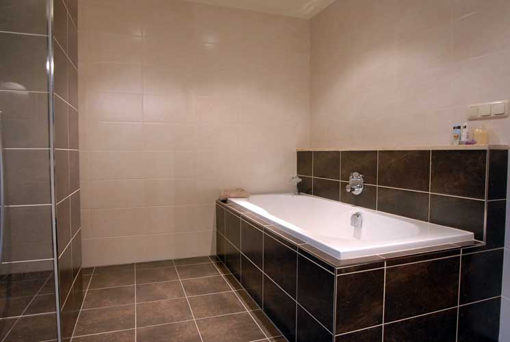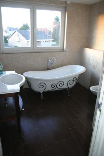 Een klassieke badkamer met nieuwe technologie, inloopdouche en vrijstaand bad.