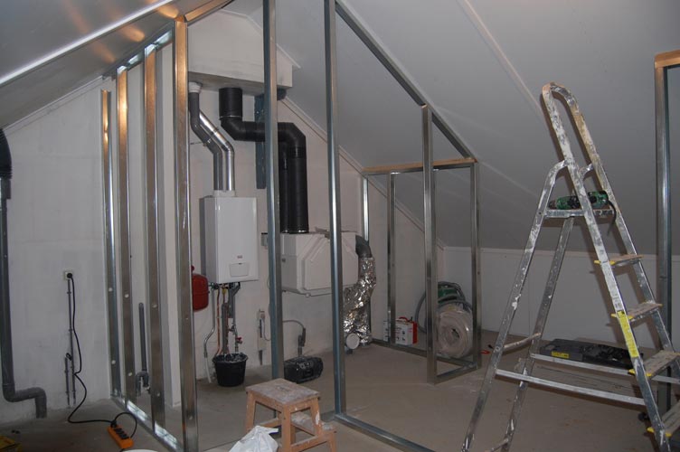 Een open zolder waarbij de cv-installatie duidelijk aanwezig is ondergaat een metamorfose en wordt omgebouwd tot twee slaapkamers en een apart ketelhok. Een meerwaarde voor uw huis!